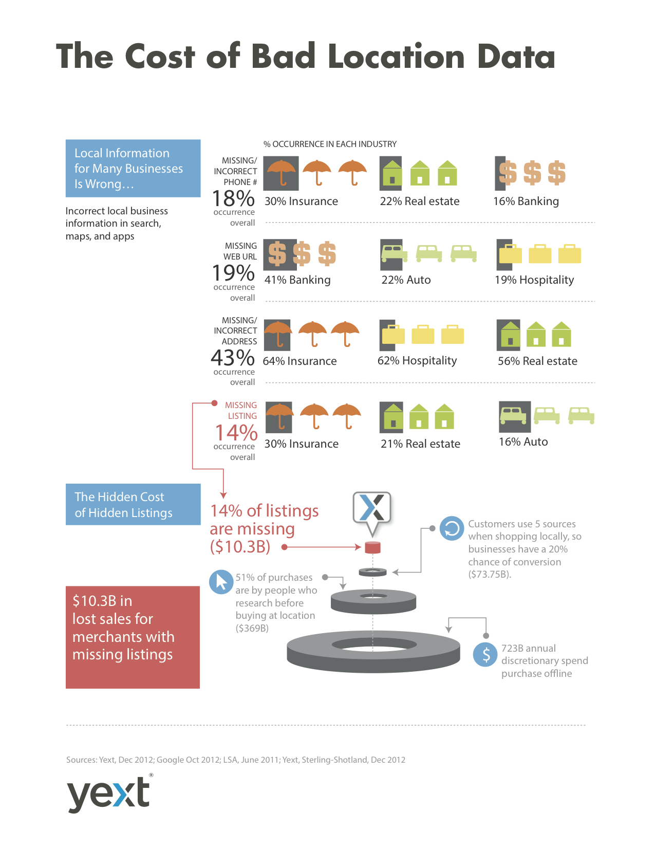 In order to find the scope of the problem, industry analysts, Andrew Shotland and Greg Sterling, looked at local listings from more than 40,000 business listings. The data is from companies using location information software from Yext. The full impact of their findings is published in the Yext Quarterly, but the Cost of Bad Location Data infographicsummarizes both the problem and the dollars being lost.