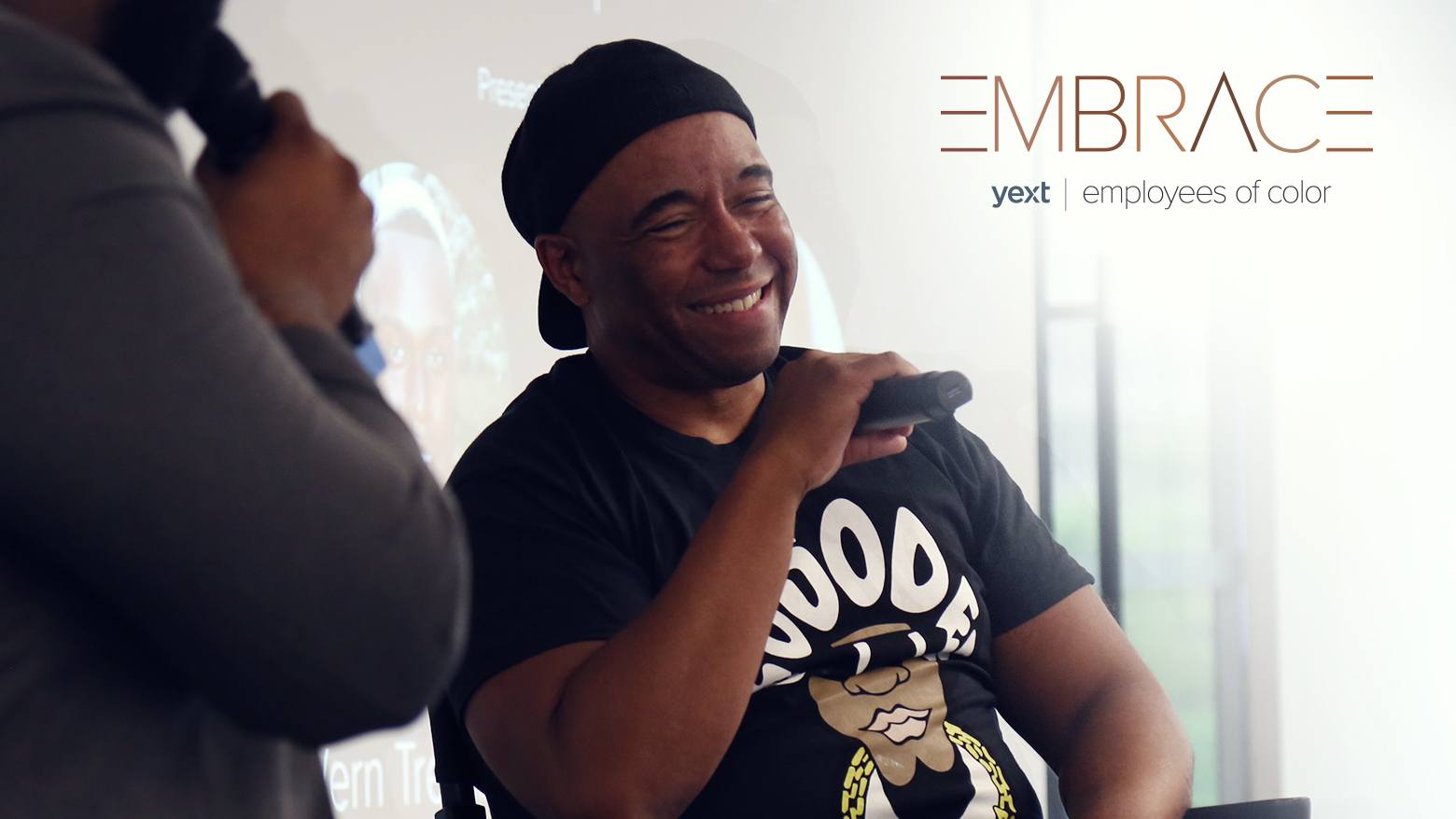 EMBRACE — whose mission is to build Yext as a lighthouse company for racial diversity — kicked off the day with a YextTalks featuring Sony Music Executive, Jeffrey James. As the Director of Artists & Repertoire at Sony, James has over 20 years of experience in the music industry. EMBRACE's Vern Tremble led a fireside chat with James in which he walked the crowd through his career path and the lessons he learned throughout his journey. James described what it's like to be a person of color in the music industry, as well as how the industry is becoming more inclusive of people from all backgrounds. James also discussed in great detail about how technology disrupted the traditional music business model and how it is continuously evolving.