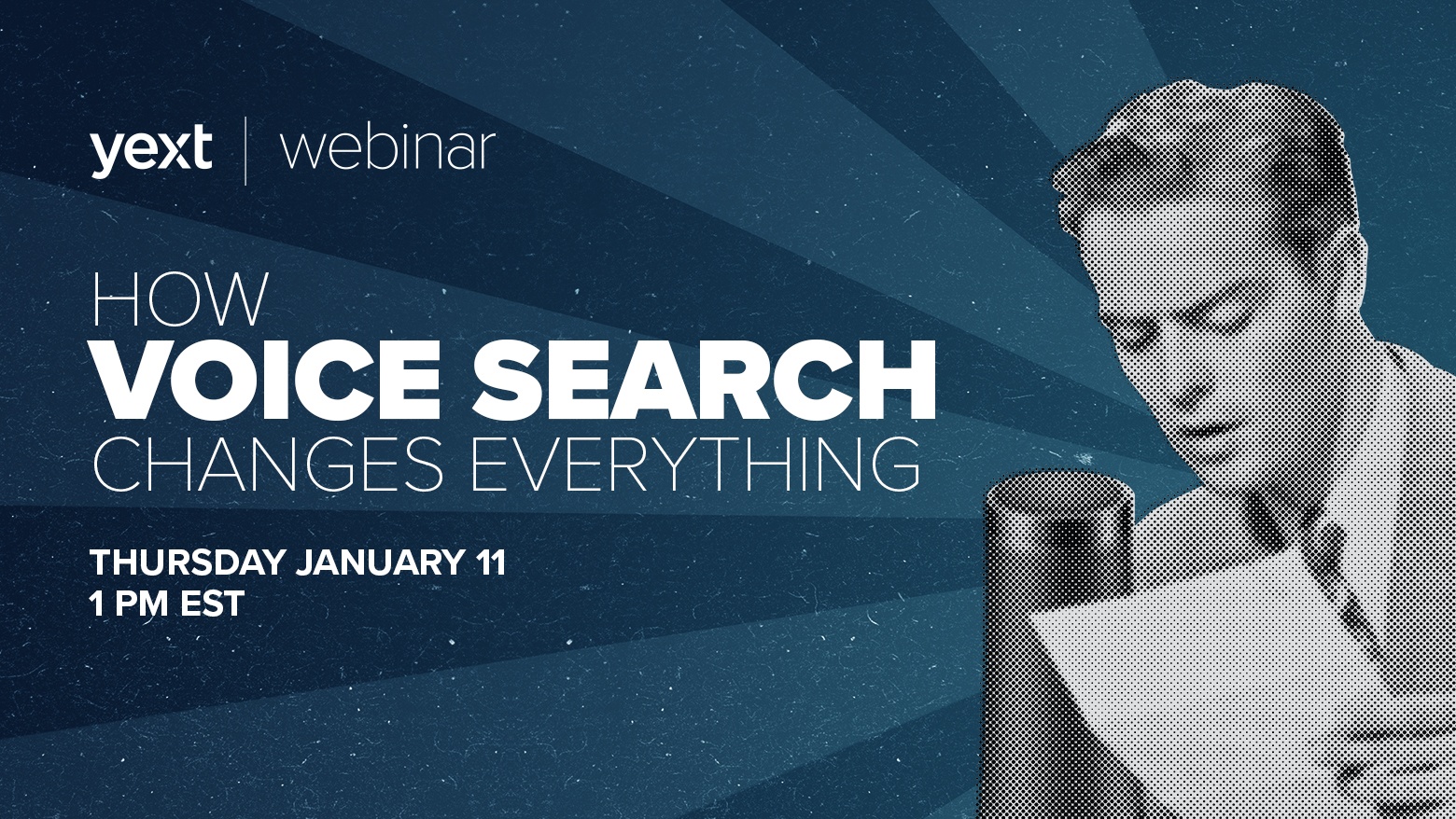 On Thursday, January 11 at 1:00pm ET / 10:00am PT, join voice search experts Ed Doran (Co-Founder, Microsoft Cortana), Wally Brill (Senior Persona Designer, Adecco at Google), and our own Duane Forrester (VP, Industry Insights, Yext and author of our recent eBook, *How Voice Search Changes Everything)*for a webinar to learn how voice search impacts your business.