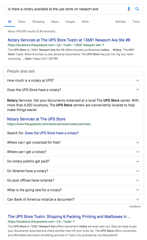 Here's how it works: Try searching for "Is there a notary available at the UPS Store on Newport Ave?" The answer appears directly in the search results — in excerpts from The UPS Store's local pages for both Tustin, CA, and the Newport Ave store. In Google's "People Also Ask" section, we also see the answer as it appears on The UPS Store's national site. Because we can see that each of these results is sourced from TheUPSStore.com, we know they are brand-verified answers.