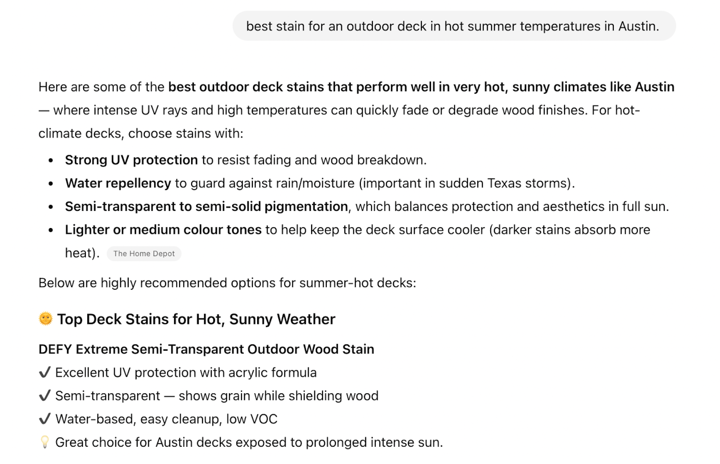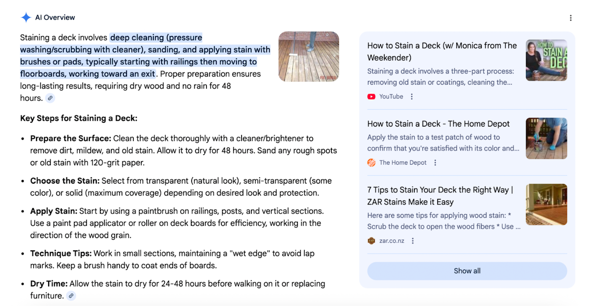 Take a look at this AI Overview for "how to stain a deck."