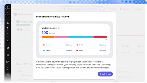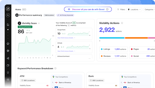 By combining AI search coverage, hyper-local benchmarking, and built-in actions across Listings, Reviews, and Pages, Scout shows you where you stand and tells you exactly what to do next.