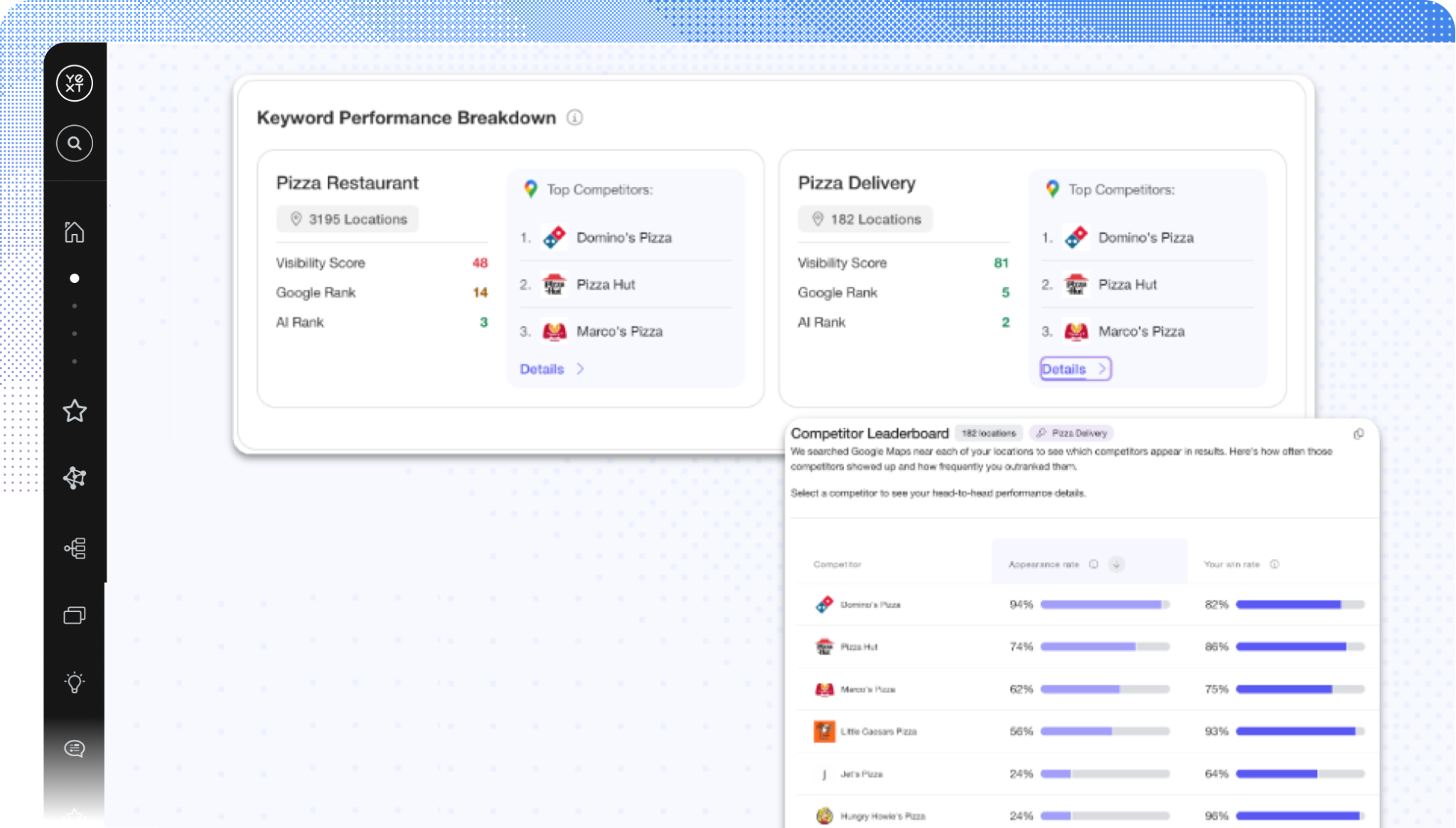 Scout benchmarks each location's search performance against top local rivals. It also shows you why a specific location is outperforming – or losing to – key competitors in its immediate area.