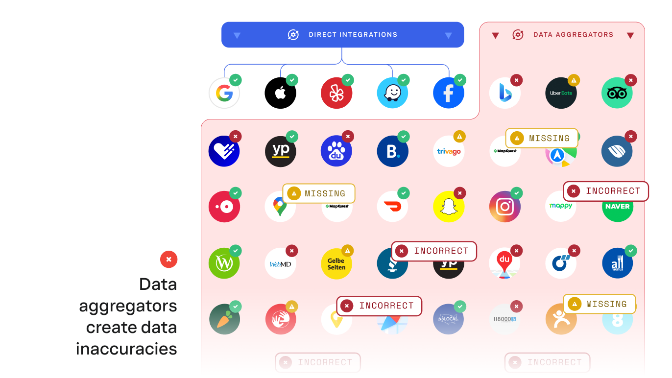 Visibility isn't just about measurement. It's about making sure that information about your brand is accurate everywhere. Other platforms rely on data aggregators to manage listings, which can lead to lower visibility across search platforms. Yext is different.