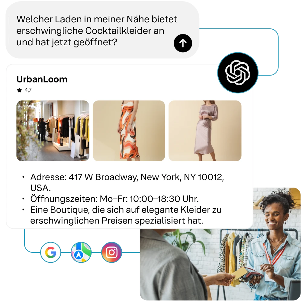 Erhöhen Sie die Sichtbarkeit in KI und Suchmaschinen, um die Entdeckungen von Käufern in Ladenbesuche und Online-Käufe umzuwandeln.