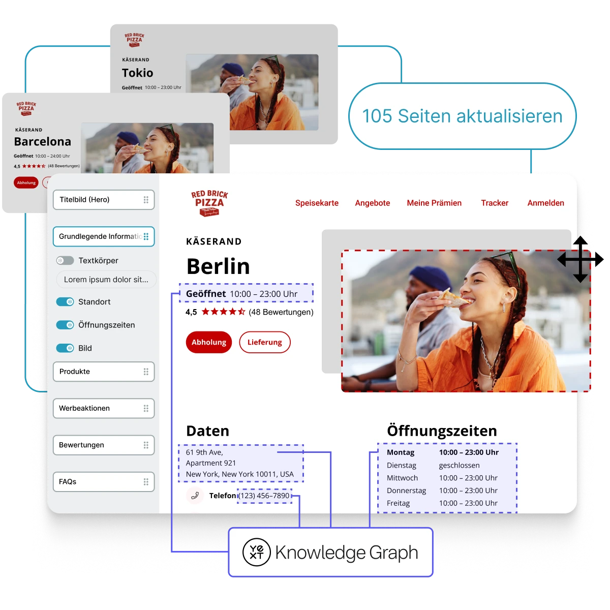 Aktualisieren Sie Ihren Eintrag einmal im Knowledge Graph und sehen Sie, wie die Änderungen auf Pages, Listings und Reviews übertragen werden. Beseitigen Sie Silos und garantieren Sie Genauigkeit an jedem Kontaktpunkt.