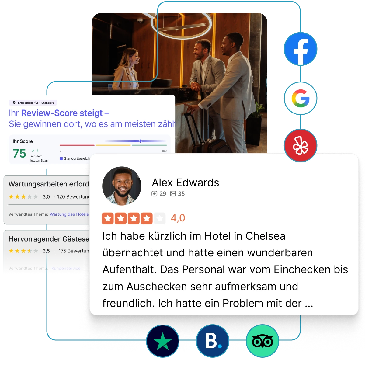 Verfolgen Sie Bewertungen von Google, Facebook, Yelp und mehr als 80 Branchen-Websites in einem zentralen Dashboard. So optimieren Sie Ihr Reputationsmanagement und erhalten einen einheitlichen Überblick über Markenwahrnehmung. Nutzen Sie intelligente Filter und automatische Warnmeldungen, um sicherzustellen, dass kein Feedback übersehen wird, selbst bei Tausenden von Standorten.