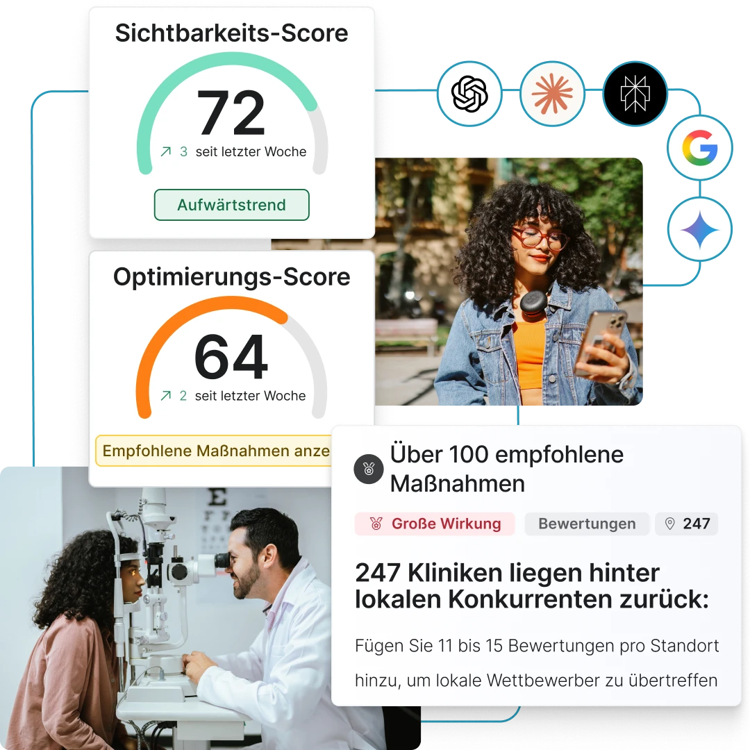 Verfolgen Sie, wie Sie bei Google und führenden KI-Engines (ChatGPT, Gemini, Perplexity, Claude) nach Standort und Wettbewerber angezeigt werden. Beobachten Sie die Trends im Laufe der Zeit, um zu sehen, wo Sie gewinnen oder verlieren – und warum.
