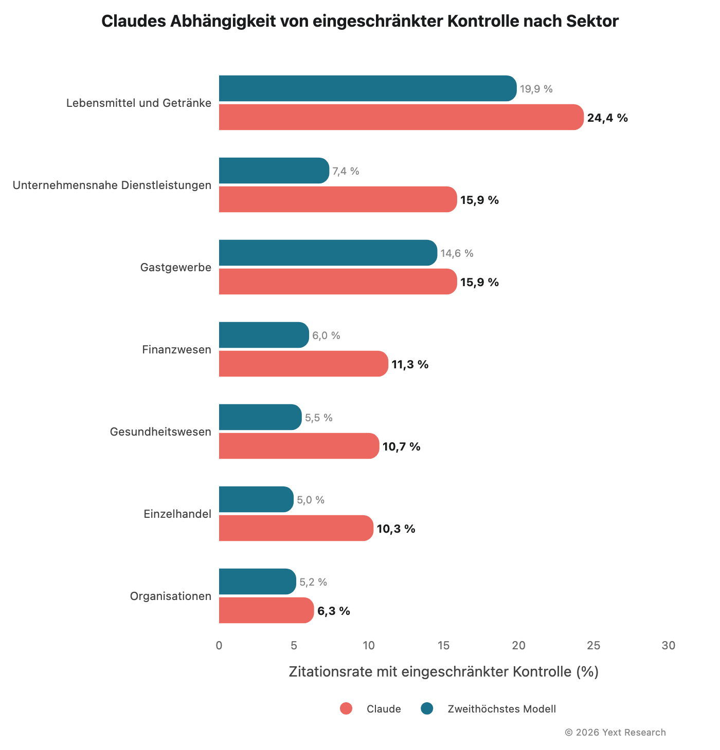 In allen sieben Sektoren führt Claude bei der Zitierungsanzahl für „Eingeschränkte Kontrolle“. Kein anderes Modell zeigt diese Art von richtungsweisender Konsistenz bei einer einzelnen Metrik.
