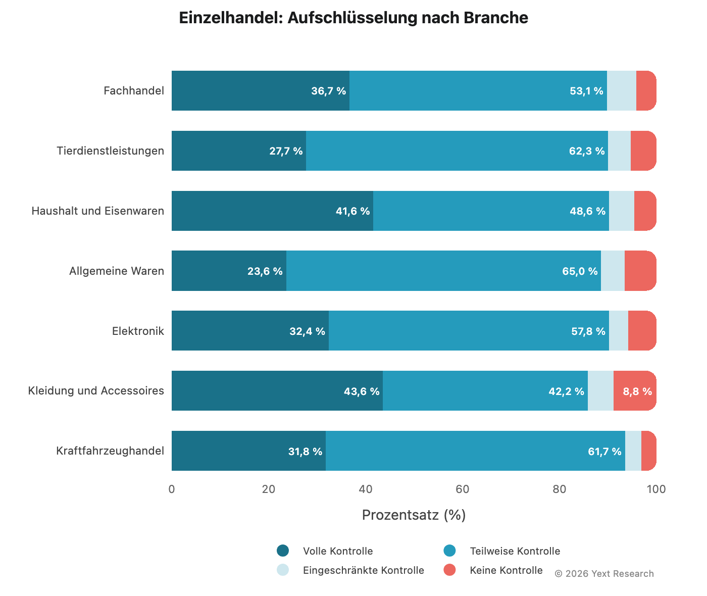 „Allgemeine Waren“ zeigt den höchsten Grad an „Begrenzter Kontrolle“ (64,99 %) und den niedrigsten Wert an „Volle Kontrolle“ (23,60 %), was auf eine starke Abhängigkeit von Aggregatoren und Vergleichs-Websites hindeutet. „Kleidung und Accessories“ hat den höchsten Wert an „Keine Kontrolle“ (8,82 %), was wahrscheinlich den Einfluss von Modepublikationen und Style-Blogs widerspiegelt.