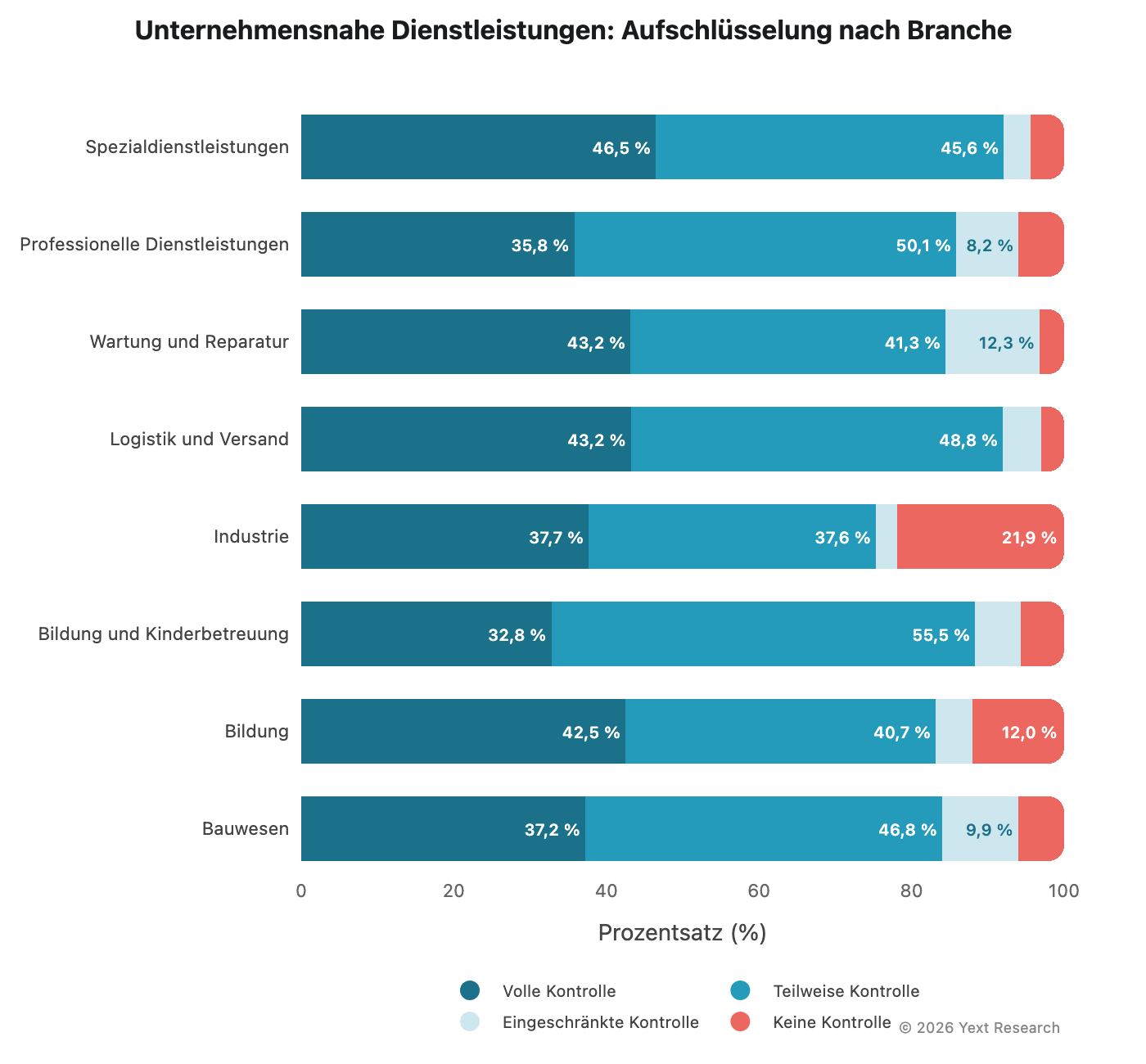 Bei Wartung und Reparatur sticht die Kategorie „Eingeschränkte Kontrolle“ (12,31 %) besonders hervor, was Sinn ergibt: Bewertungsplattformen wie Yelp, Angi und HomeAdvisor spielen eine zentrale Rolle dabei, wie Kund*innen Klempner- und Elektriker-Dienstleistungen finden.