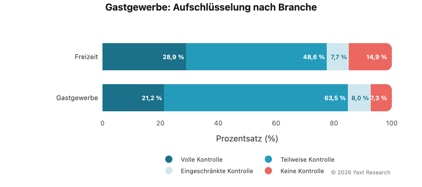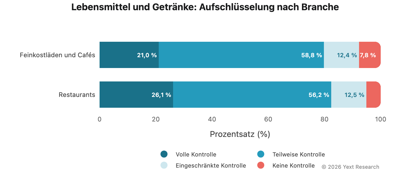 Beide Branchen weisen ein ähnliches Maß an eingeschränkter Kontrolle auf (~12,5 %), aber „Feinkostläden und Cafés“ hat eine niedrigere „Volle Kontrolle“ (21,03 % vs 26,15 %) und eine höhere „Keine Kontrolle“ (7,75 % vs 5,12 %), was auf ein größeres Vertrauen in Food-Blogs und unabhängige Bewertungen hinweist.