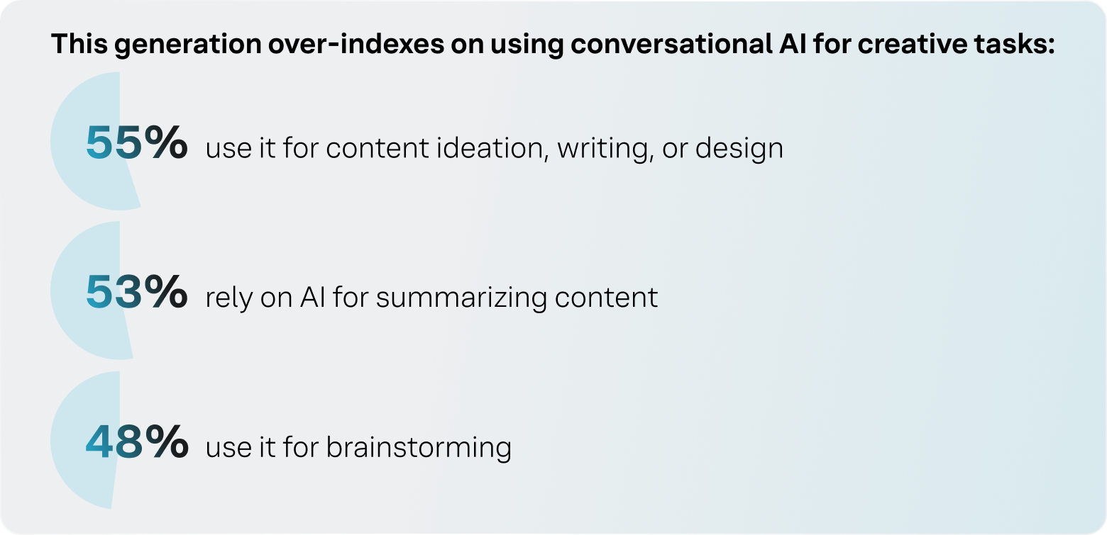 Pour la génération Z, la recherche ne consiste pas seulement à trouver des réponses — c'est une source d'imagination. Cette génération est très encline à utiliser l'IA conversationnelle pour des tâches créatives.