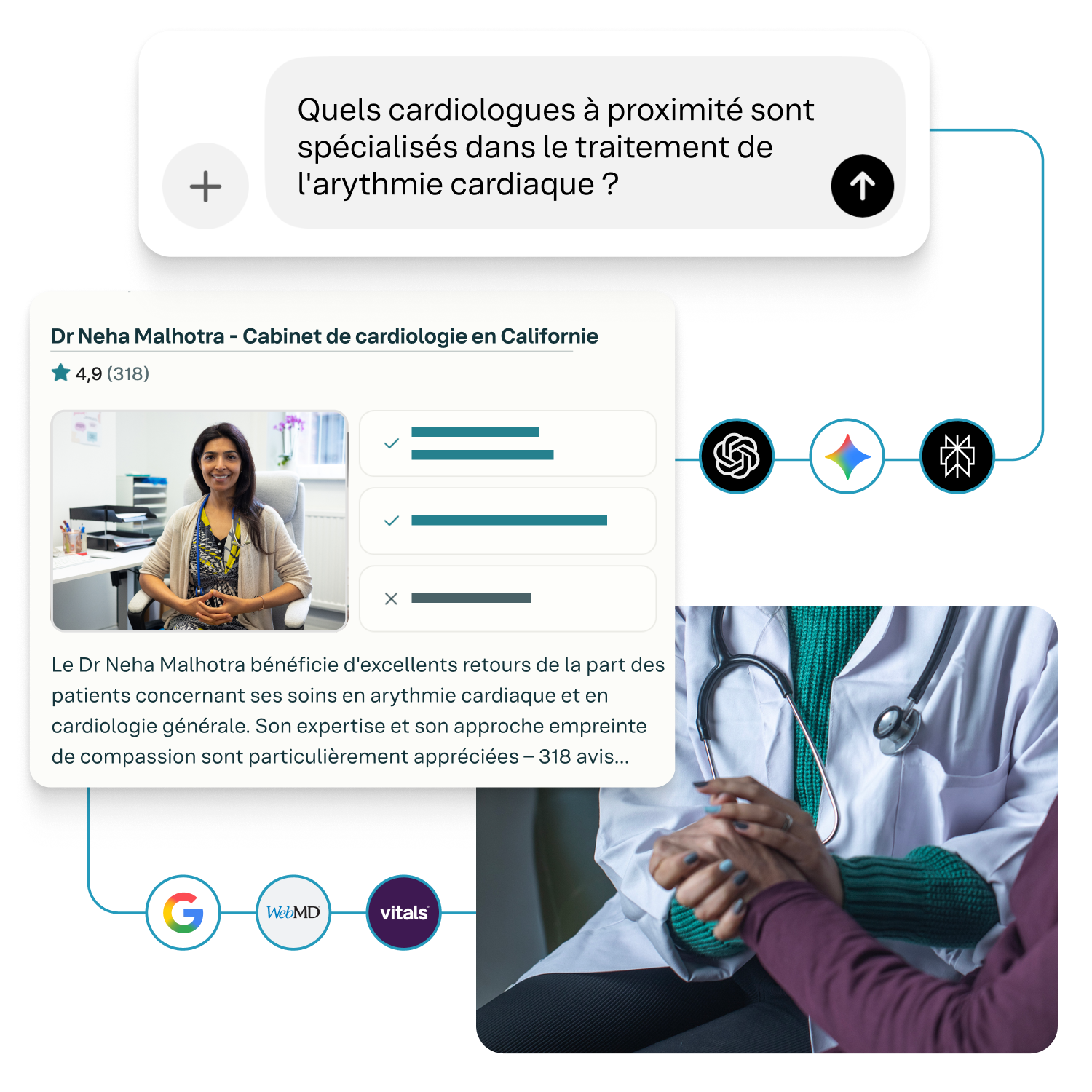 L'IA et la recherche redéfinissent la manière dont les patients découvrent les prestataires de soins. Gardez le contrôle, analysez et améliorez la façon dont vos établissements, praticiens et services apparaissent lorsque les patients recherchent des soins.