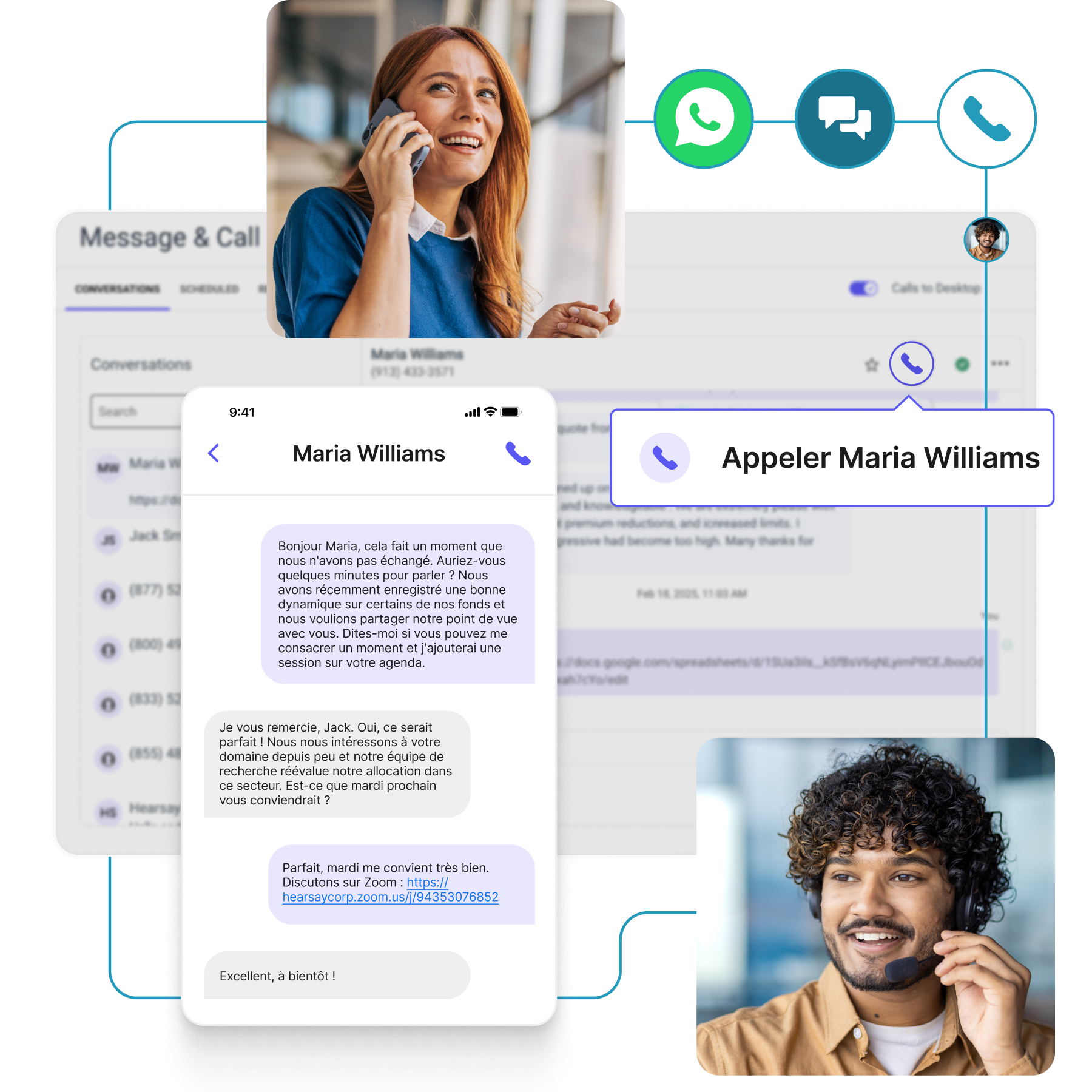 Communiquez par SMS, WhatsApp ou appels vocaux dans des conversations personnalisées, riches en contexte et alimentées par les données CRM, aidant ainsi les conseillers à bâtir des relations clients plus solides.