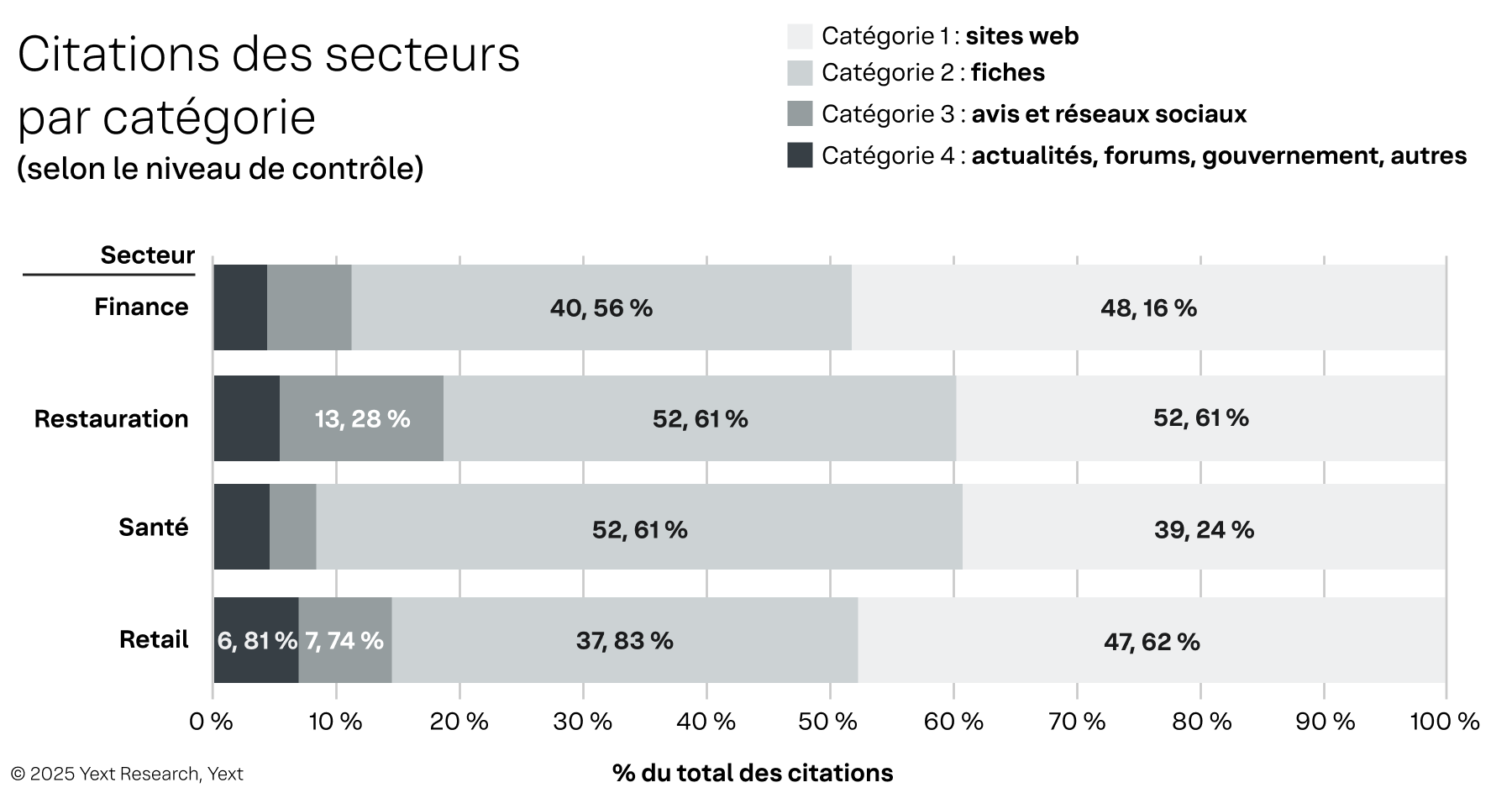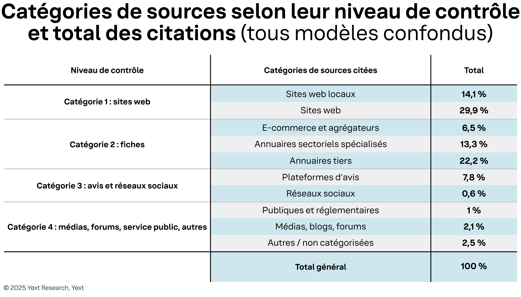 La conclusion la plus significative est encourageante : les marques peuvent influencer ou gérer directement les sources représentant environ 86 % de toutes les citations visibles par les consommateurs. Ce haut degré de contrôle n'apparaît que lorsqu'on passe d'une perspective centrée sur la marque à une analyse par localisation.
