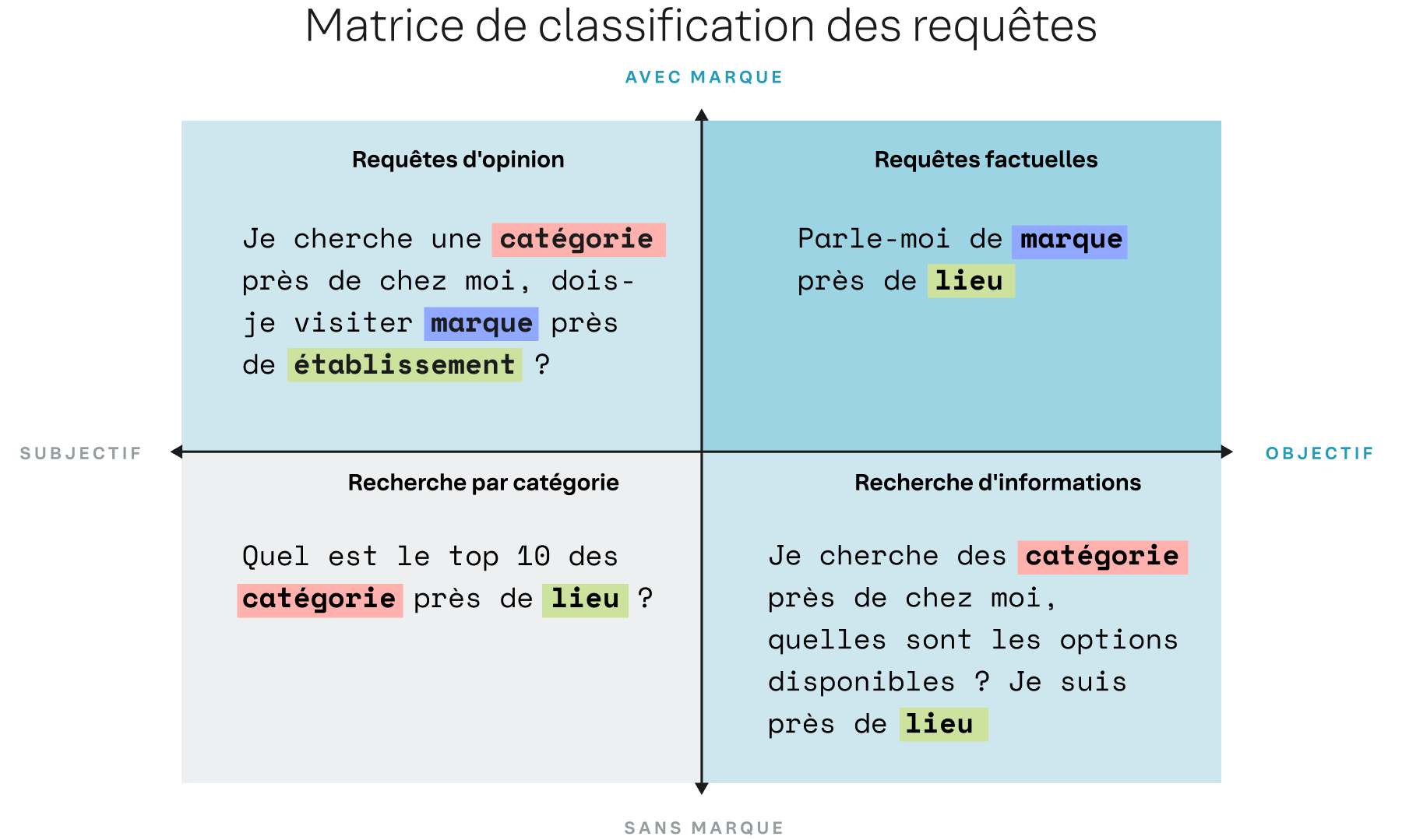 - Le consommateur formule intrinsèquement sa requête selon deux axes : avec marque ou sans marque, et objectif ou subjectif.