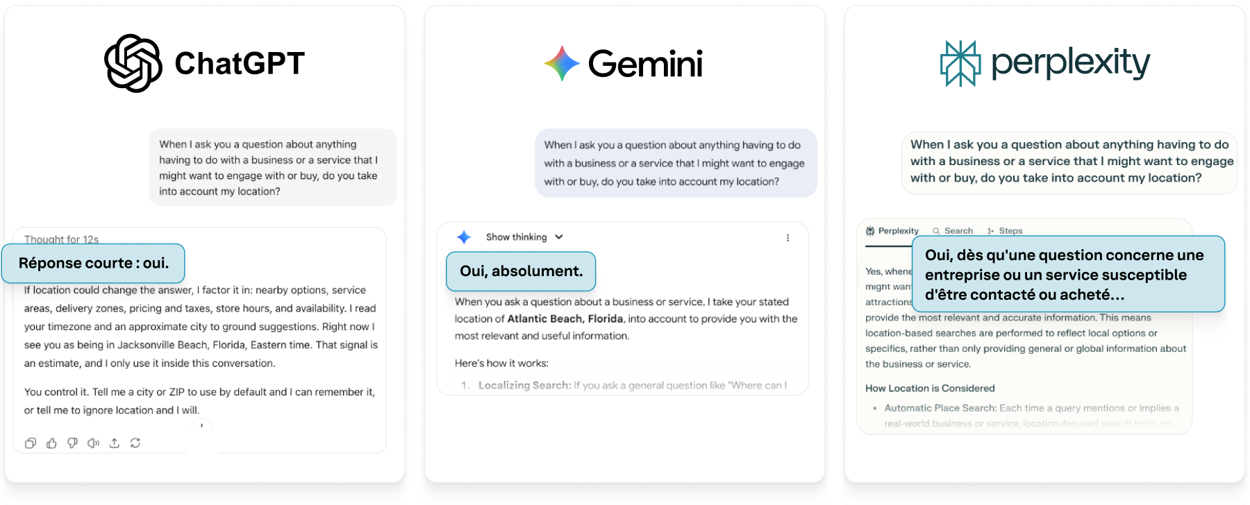 Une fois l'emplacement de l'utilisateur et le contexte pris en compte, comme c'est souvent le cas pour les questions portant sur des entreprises, les tendances de citation évoluent de manière significative. Les modèles d'IA eux-mêmes déclarent adopter cette approche centrée sur la localisation. Lorsqu'on leur pose directement la question, les modèles de Google, OpenAI et Perplexity confirment qu'ils utilisent la position des consommateurs pour répondre aux questions sur des entreprises et des services.