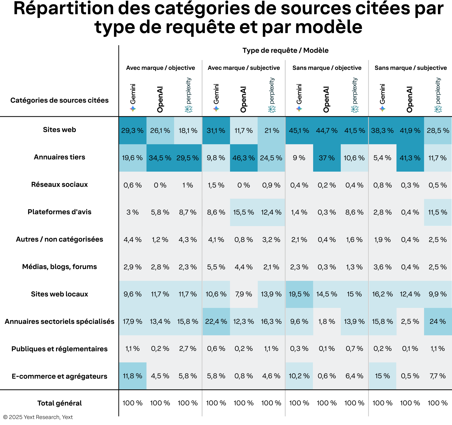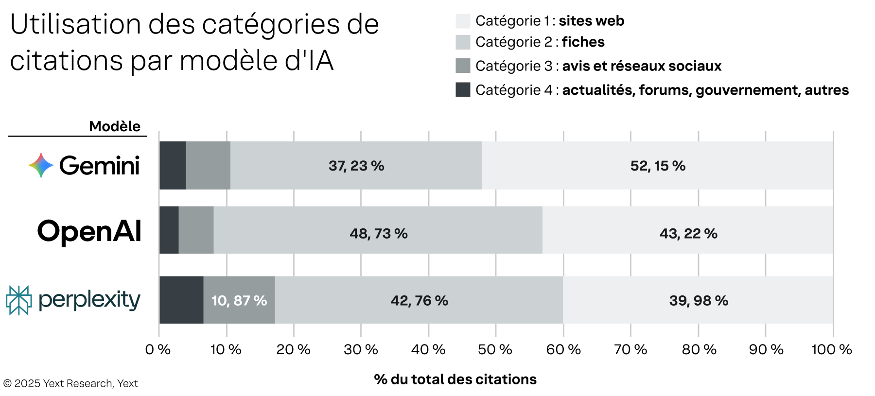 Le comportement des citations est loin d'être uniforme d'un modèle d'IA à l'autre. Nous constatons en effet que la stratégie de visibilité d'une marque doit tenir compte des préférences de chaque plateforme en matière de source d'information.