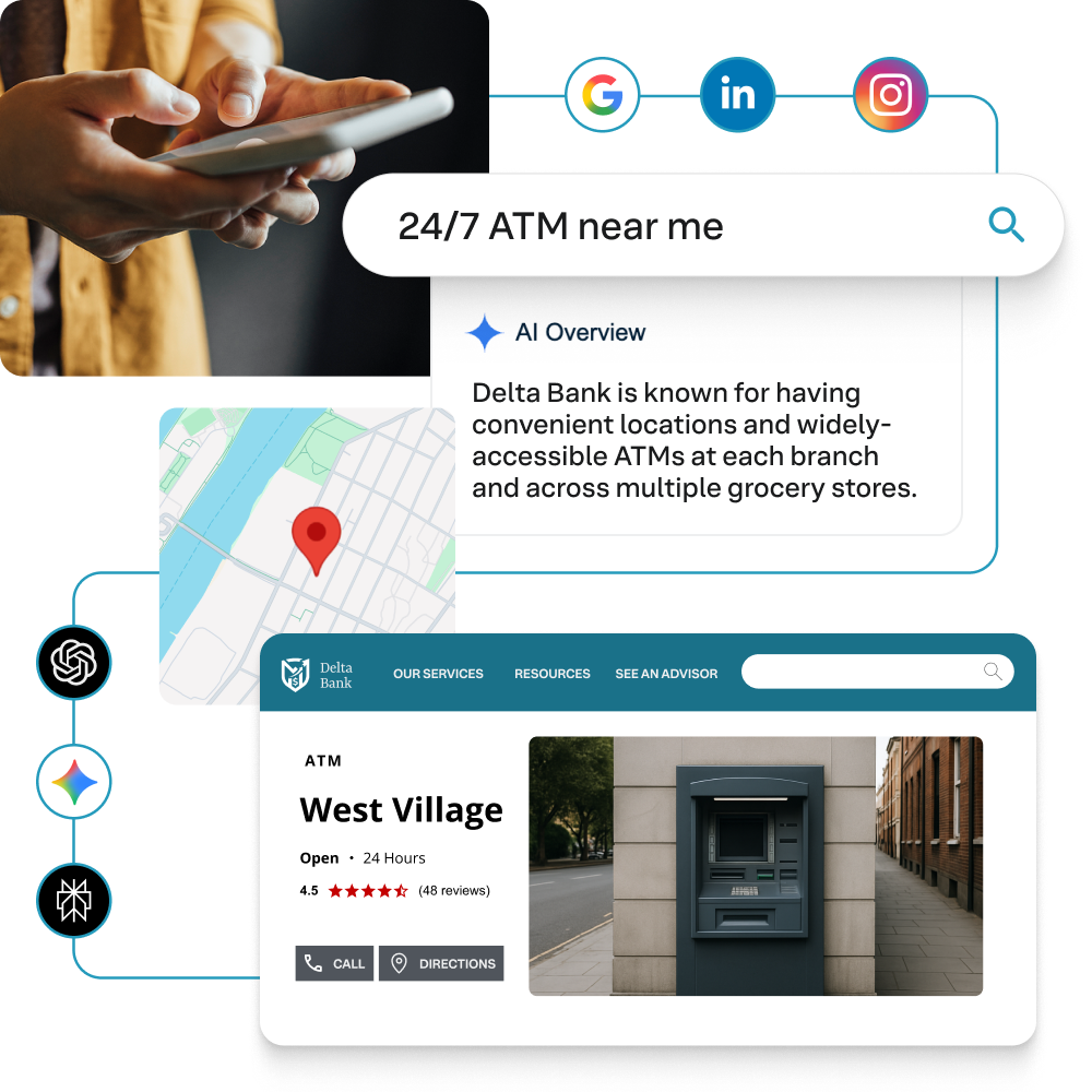 From Google and Apple Maps to Yelp and ChatGPT, customers expect to find accurate details about your branches, bankers, and ATMs. With direct integrations to 200+ publishers, your bank's information updates instantly across the ecosystem, keeping you visible and trusted wherever customers compare options.