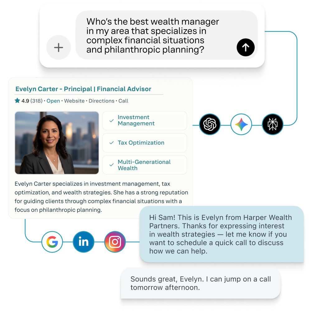 Make every advisor discoverable and credible across AI, search, and social, so your firm grows market share, protects reputation, and stays compliant.