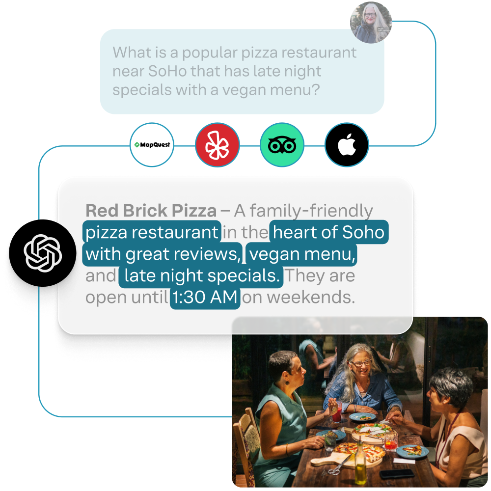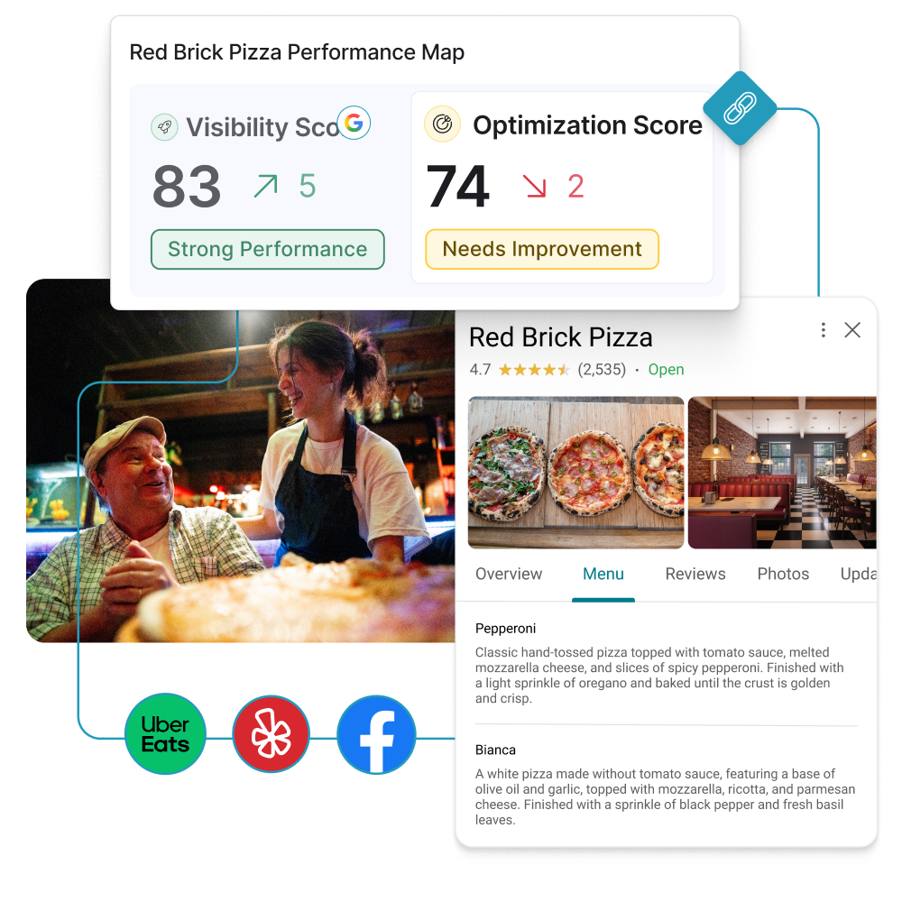Help ensure your menus, hours, and reviews surface first across AI and search, turning every moment of discovery into visits, bookings, and online orders.