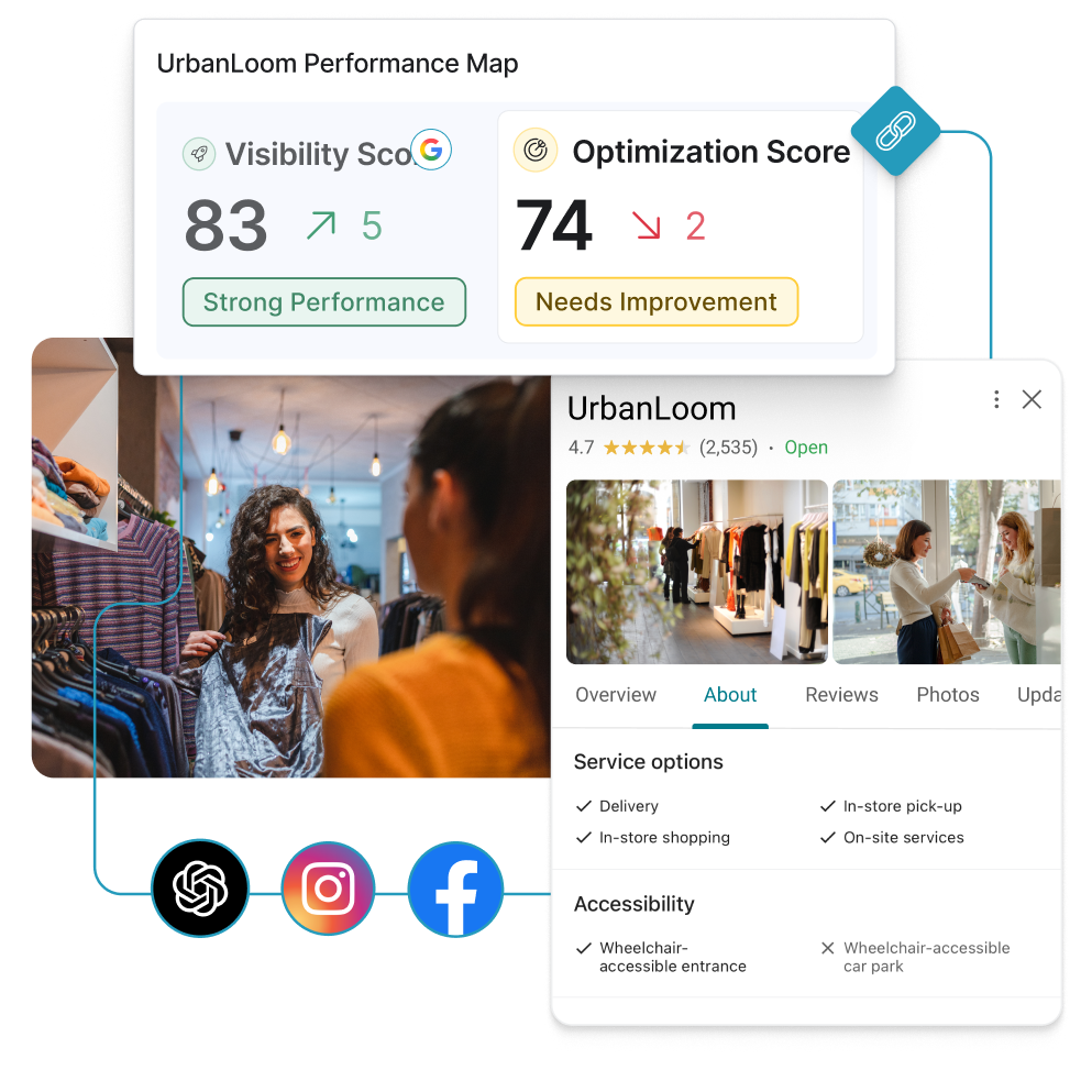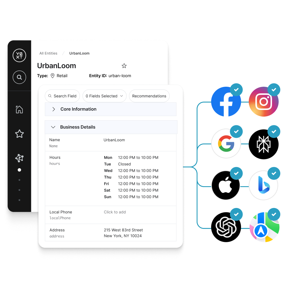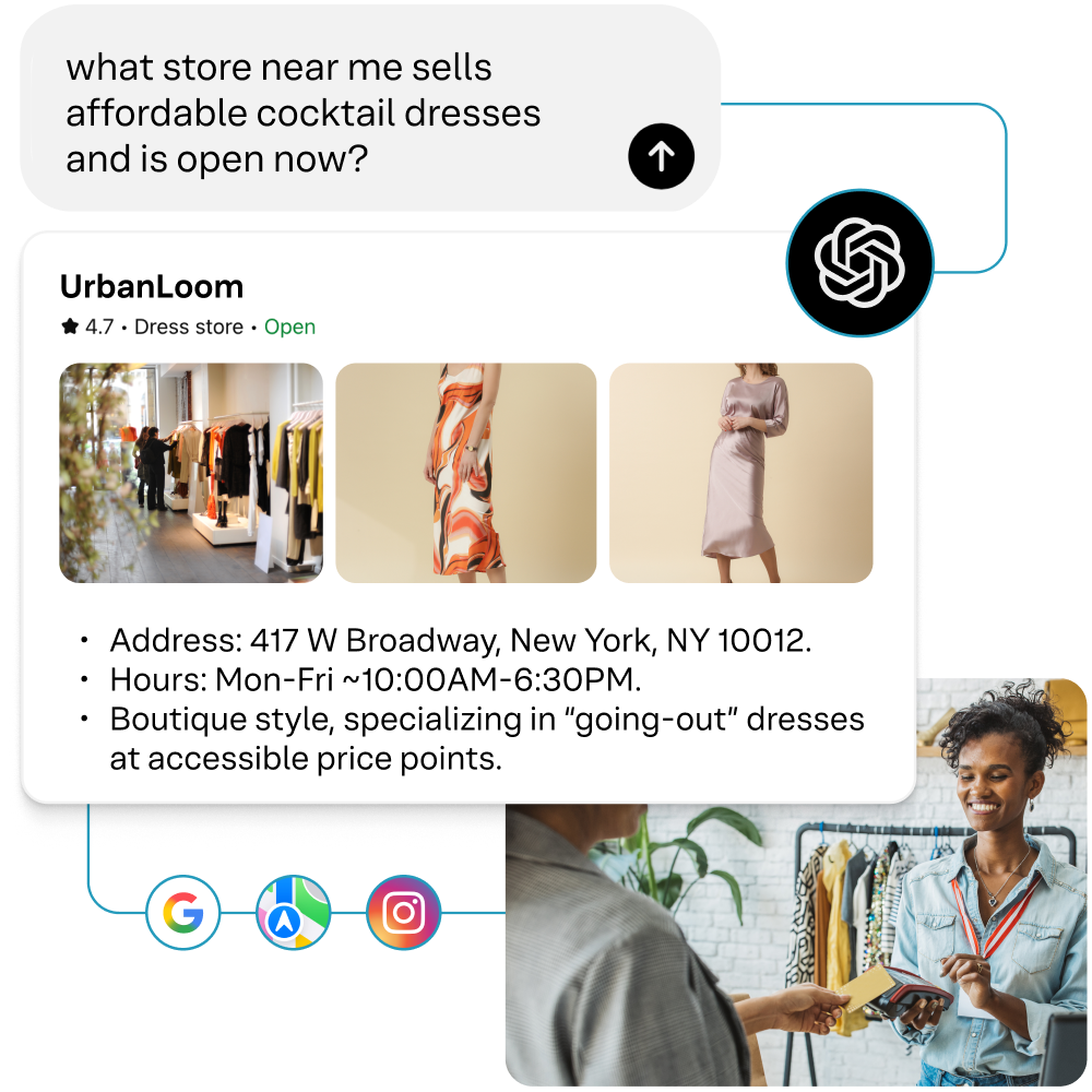 Sync brand and store updates in real time across 200+ channels — from Google Maps to ChatGPT — ensuring accurate, consistent information everywhere shoppers look.