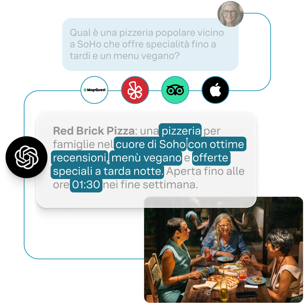 Aiuta a garantire che i tuoi menu, orari e recensioni emergano per primi sia tramite l'IA che la ricerca, trasformando ogni momento di scoperta in visite, prenotazioni e ordini online.