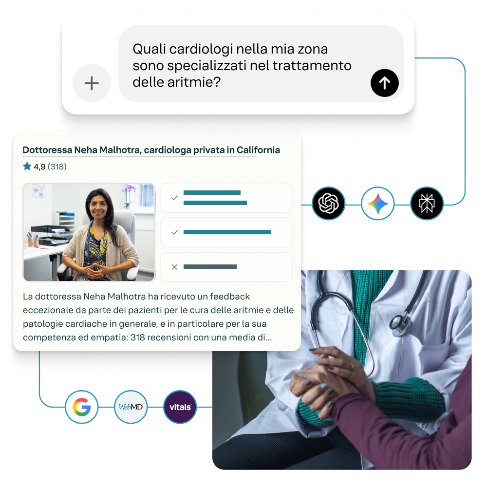 L'IA e la ricerca influenzano la scoperta dei pazienti. Prendi il controllo, comprendi e migliora il modo in cui le tue strutture, i tuoi fornitori e i tuoi servizi si presentano quando più conta.