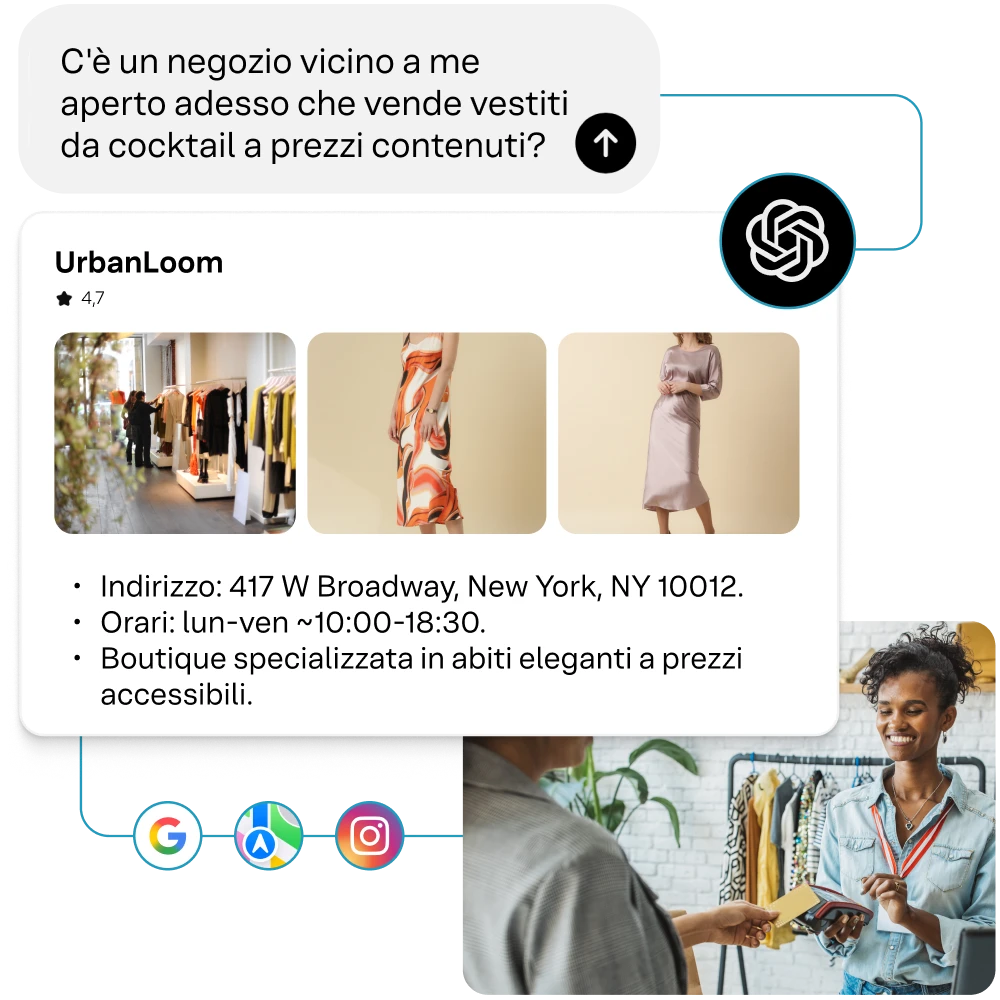Affermati su IA e motori di ricerca assicurando che le informazioni su prodotti, negozi e brand siano accurate e compaiano per prime, favorendo il traffico in negozio, un sentiment positivo e vendite misurabili.