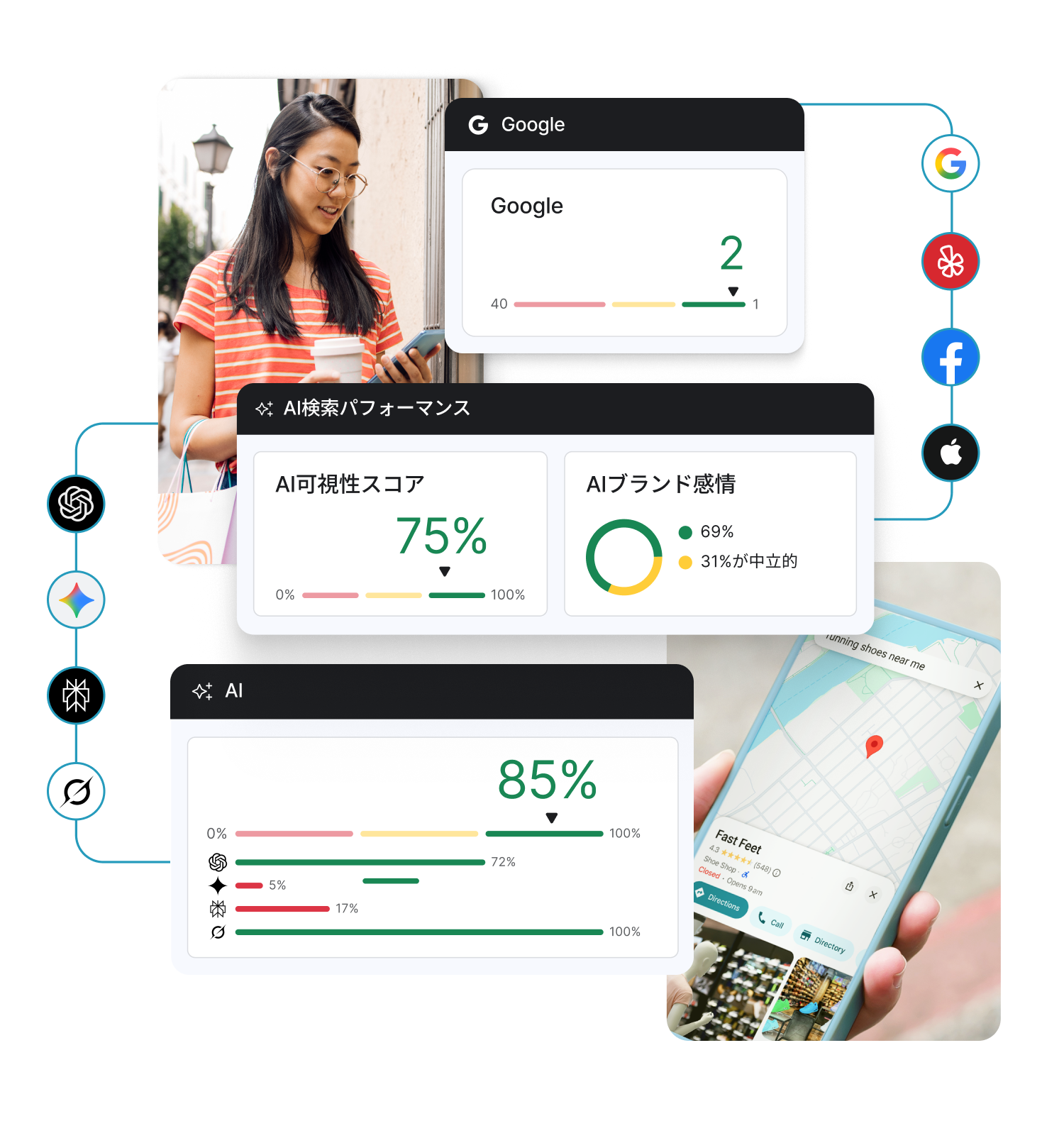 正確なローカルリスト、高評価のレビュー、ローカルページ、ローカライズされたソーシャルコンテンツを使用して、従来のAIおよびソーシャル検索で見つかりましょう。
