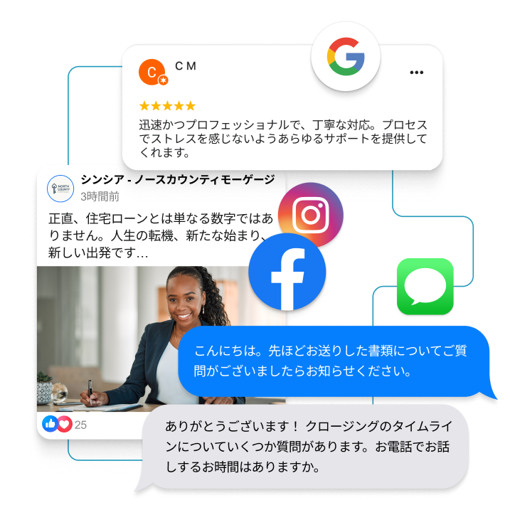 オンラインレビュー、ハイパーローカルなソーシャルコンテンツ、コンプライアンスに準拠した1:1メッセージングを通じて顧客エンゲージメントを促進します。