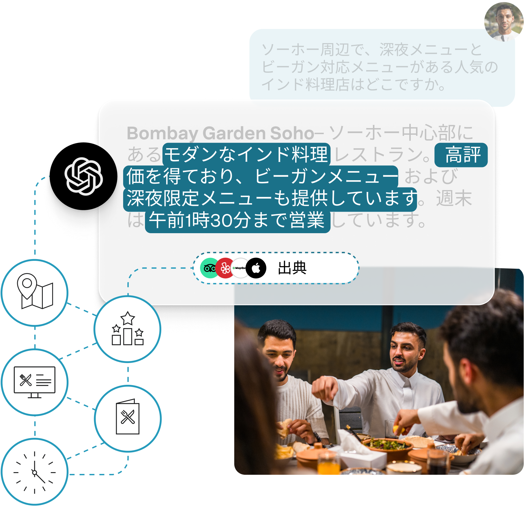 ChatGPTなどのAIエンジンや、それらが取得するすべてのソースに、構造化された信頼できる回答を直接提供します。AI対応データを使用すると、大規模言語モデル(LLM)がビジネスを確実に解析、グラウンディング、表現できるため、結果が生成される場所に関係なく、貴ブランドの情報が正確な回答で表示されるようになります。