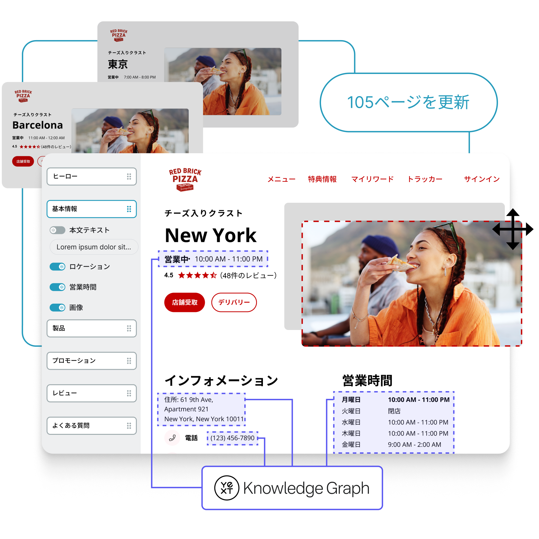 Knowledge Graph内で一度更新するだけで、Pages、Listings、Reviews全体に変更が反映されます。サイロ化を排除し、すべてのタッチポイントにおける正確性を保証します。