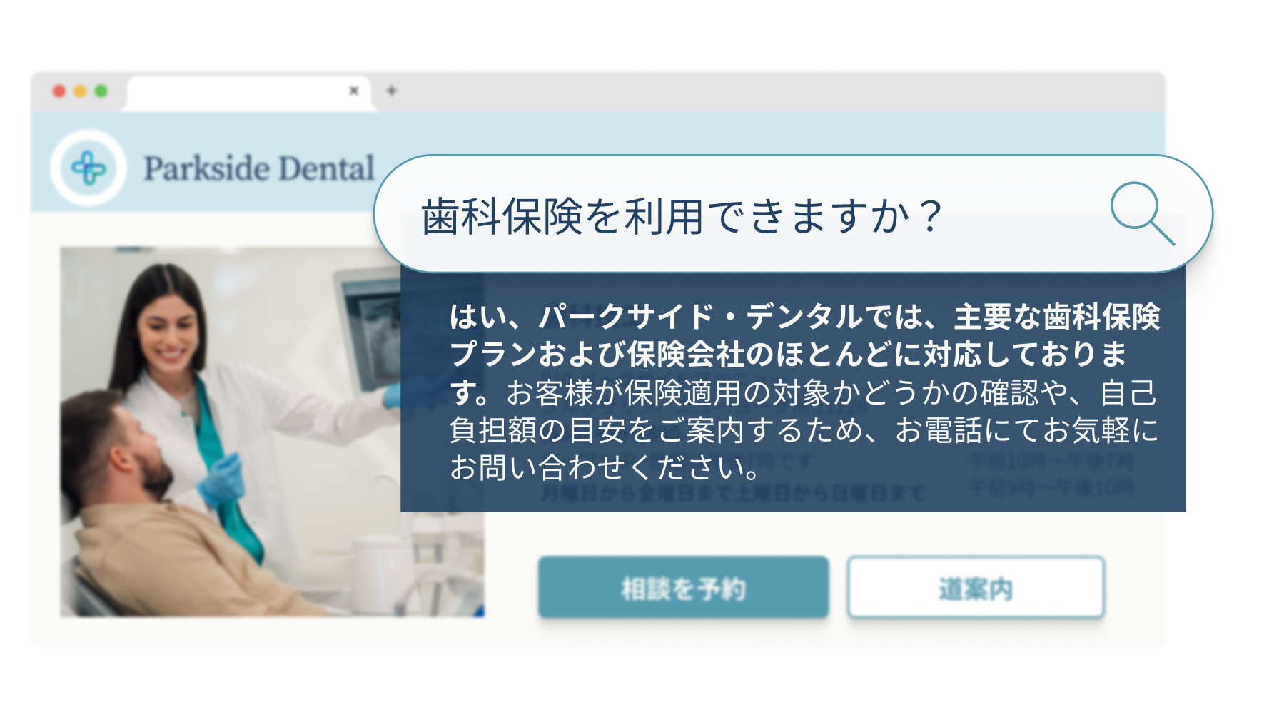 顧客が貴社のウェブサイトやローカルページで購入する準備が整ったときに、より迅速に質問に回答します。顧客の質問を洞察に変えて、AIと従来の検索の両方で可視性を改善するために公開すべきコンテンツを知らせます。