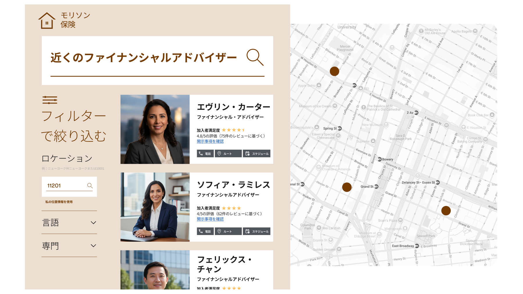 ロケーター検索:顧客が近くの場所、プロバイダー、またはアドバイザーを即座に見つけられるよう支援します。