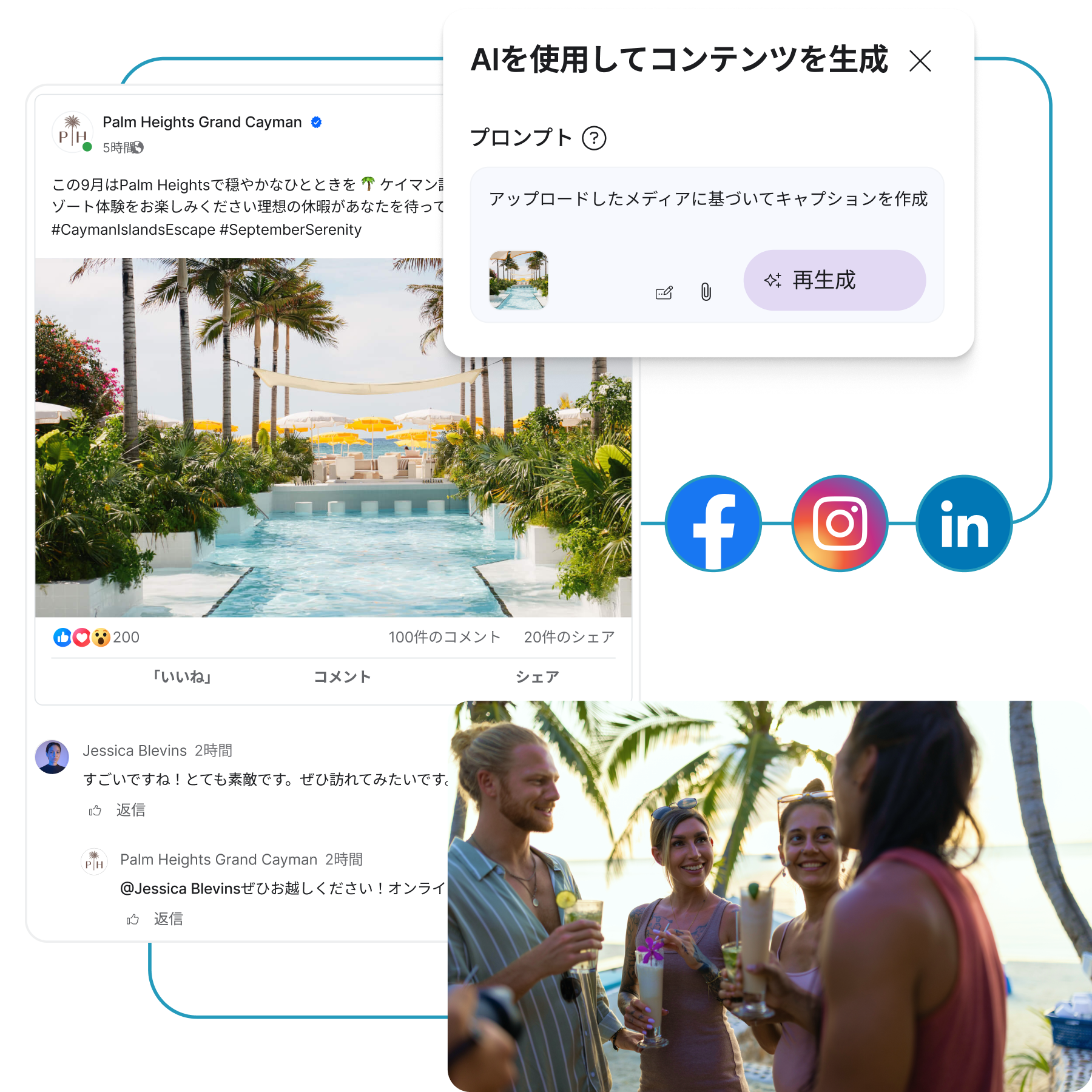 AIコンテンツ生成により新しい投稿トピックのインスピレーションが得られるため、場所ごとに似たような退屈な投稿をすることがなくなります。