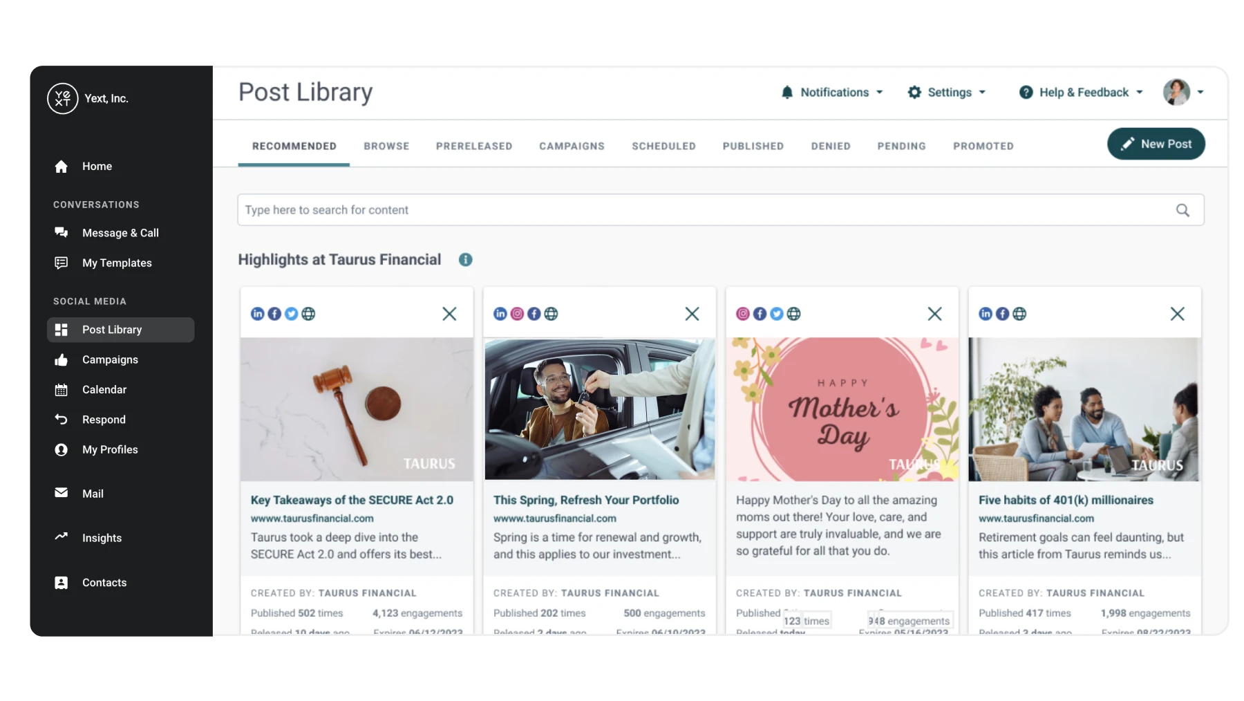 Hearsay Social is purpose-built for enterprise financial services firms, with compliance workflows, recordkeeping, and advisor-centric tools to support highly regulated industries. Yext Social, by contrast, is designed for multi-location businesses, like retail, restaurants, and hotels, to manage and measure social content strategy, brand presence, and customer engagement at scale across local markets.