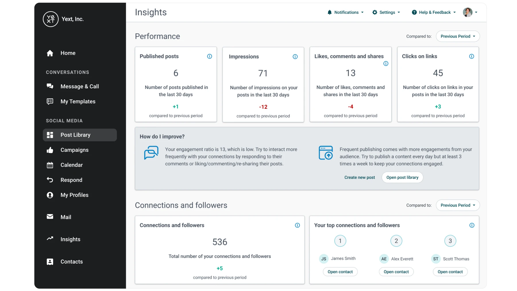 Benchmark performance, uncover audience insights, and identify top content across the organization. AI-powered recommendations help teams post more effectively and drive meaningful engagement.