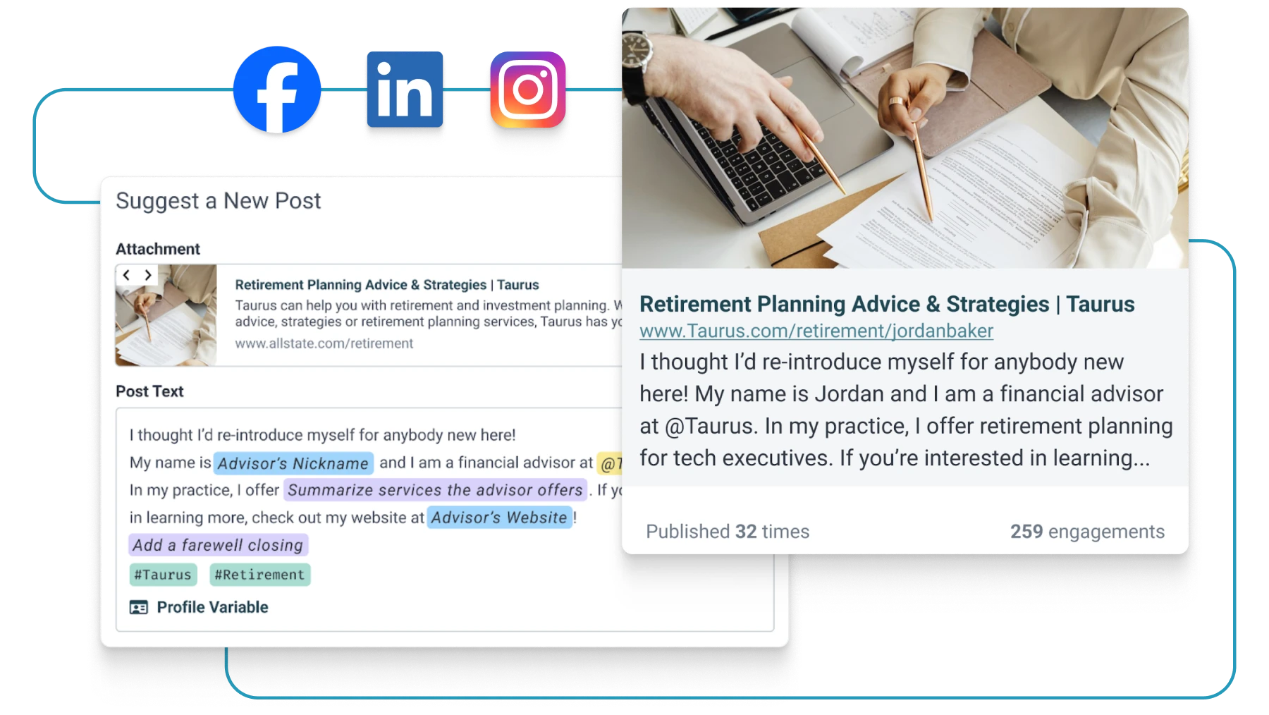 Yes. Hearsay Social enables marketing teams to create pre-approved content libraries, campaigns, and customizable templates that advisors can personalize before publishing. This approach helps support brand consistency and compliance, while still giving advisors the flexibility to tailor messages to their local audience and voice.