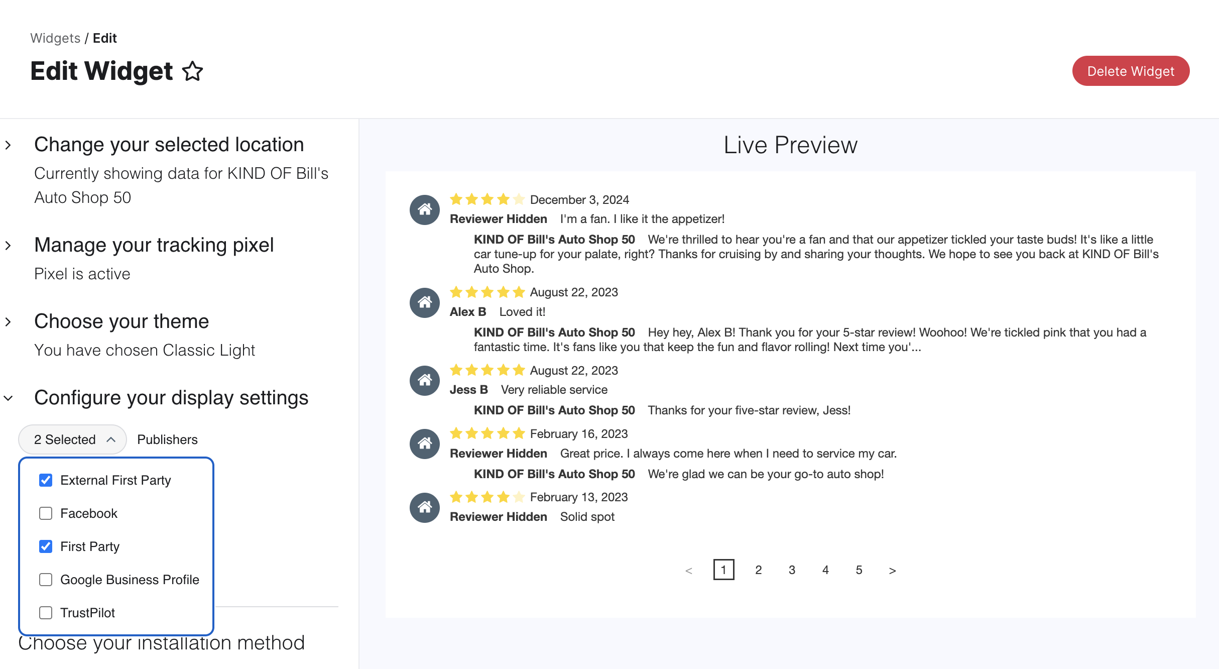 You can now easily include reviews from major third-party platforms directly in your Reviews Widget, giving potential customers a more complete view of your reputation and helping you build trust. The widget now supports integrating reviews from Google Business Profile, Facebook, and TrustPilot.