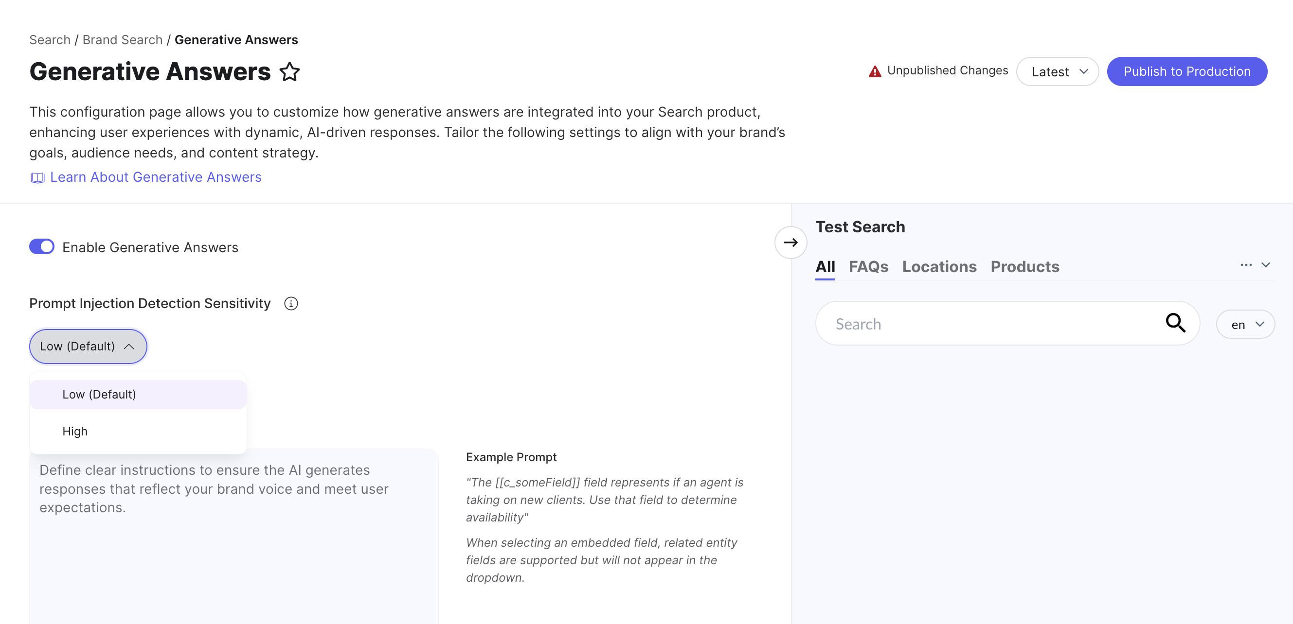 Note: Higher detection levels will cause Generative Answers to return results less frequently, as more queries will be flagged as potential injection attacks.