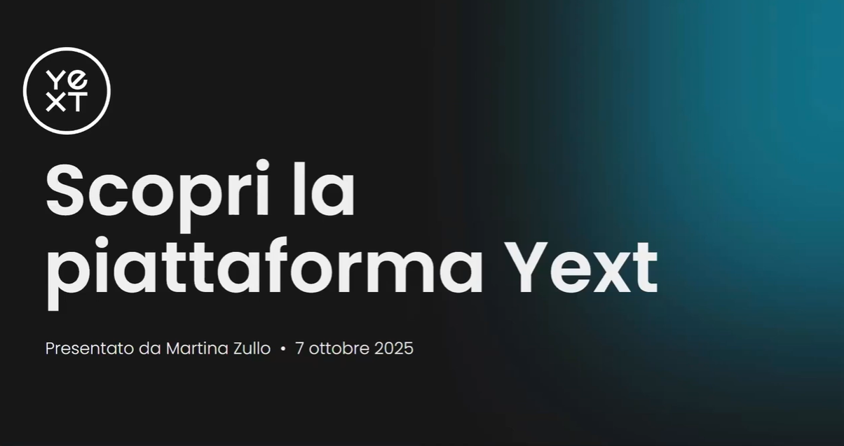 La piattaforma Yext è uno strumento fondamentale per la strategia di presenza digitale della tua azienda. Guarda questa sessione introduttiva che offrirà una panoramica completa della piattaforma Yext, compresi il suo scopo, la navigazione e i prodotti disponibili. Al termine di questa sessione, sarai in grado di: